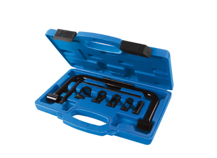La manette de serrage est équipée de trois tiges filetées pour un réglage facile et précis lors des opérations sur les soupapes. Le kit comprend également cinq embouts avec une ouverture latérale de différentes tailles (16, 19, 23, 25, 30mm), offrant une polyvalence maximale pour s’adapter à une variété de moteurs.